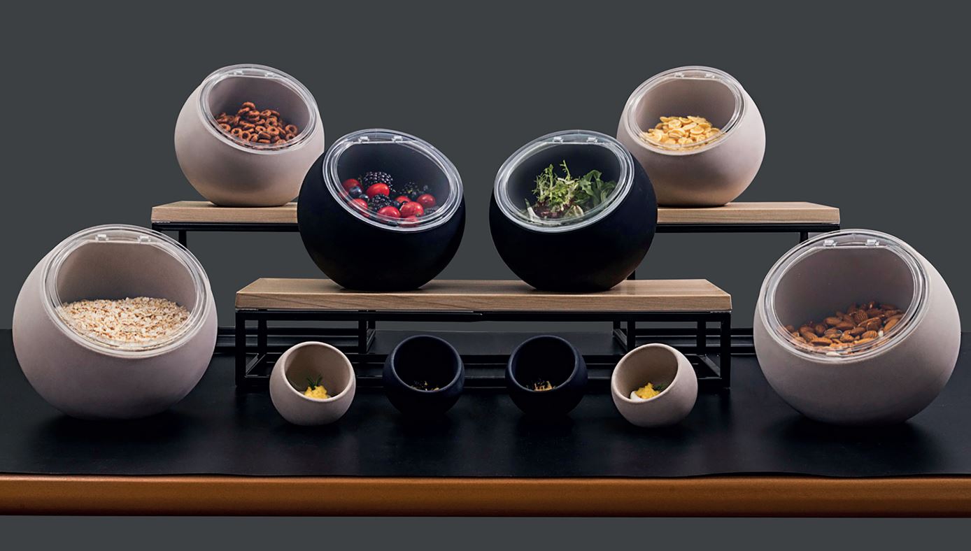 Le ciotole MOON dal design moderno donano un forte impatto visivo a ogni presentazione. Disponibili nei colori nero e sabbia, si adattano perfettamente a diversi stili e ambienti. La ciotola più piccola con elegante cucchiaio in legno è ideale per semi o frutta secca, la più grande con coperchio paraschizzi removibile è perfetta per cereali e muesli. La possibilità di combinare colori e dimensioni permette di creare allestimenti sempre nuovi e personalizzati. Realizzata in melamina resistente e lavabile in lavastoviglie, questa collezione garantisce praticità e durata anche per un uso intensivo.